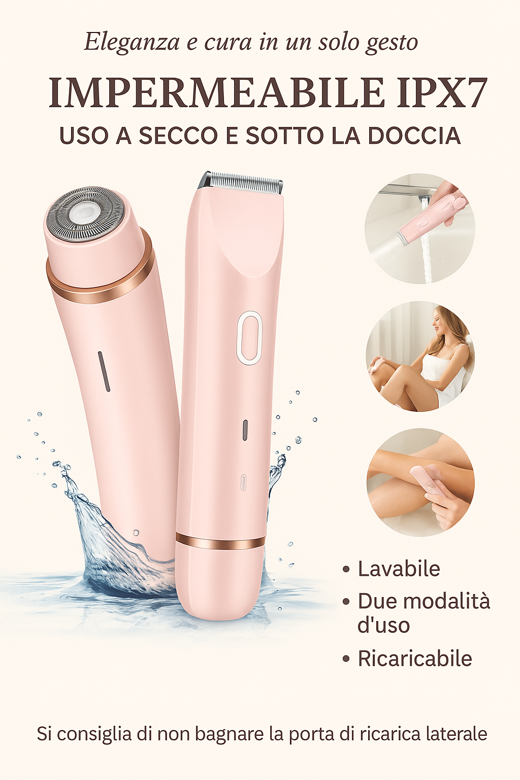 Velina™ è il rasoio 2-in-1 elegante e impermeabile, ideale per una rasatura delicata o una rifinitura precisa, anche sotto la doccia.